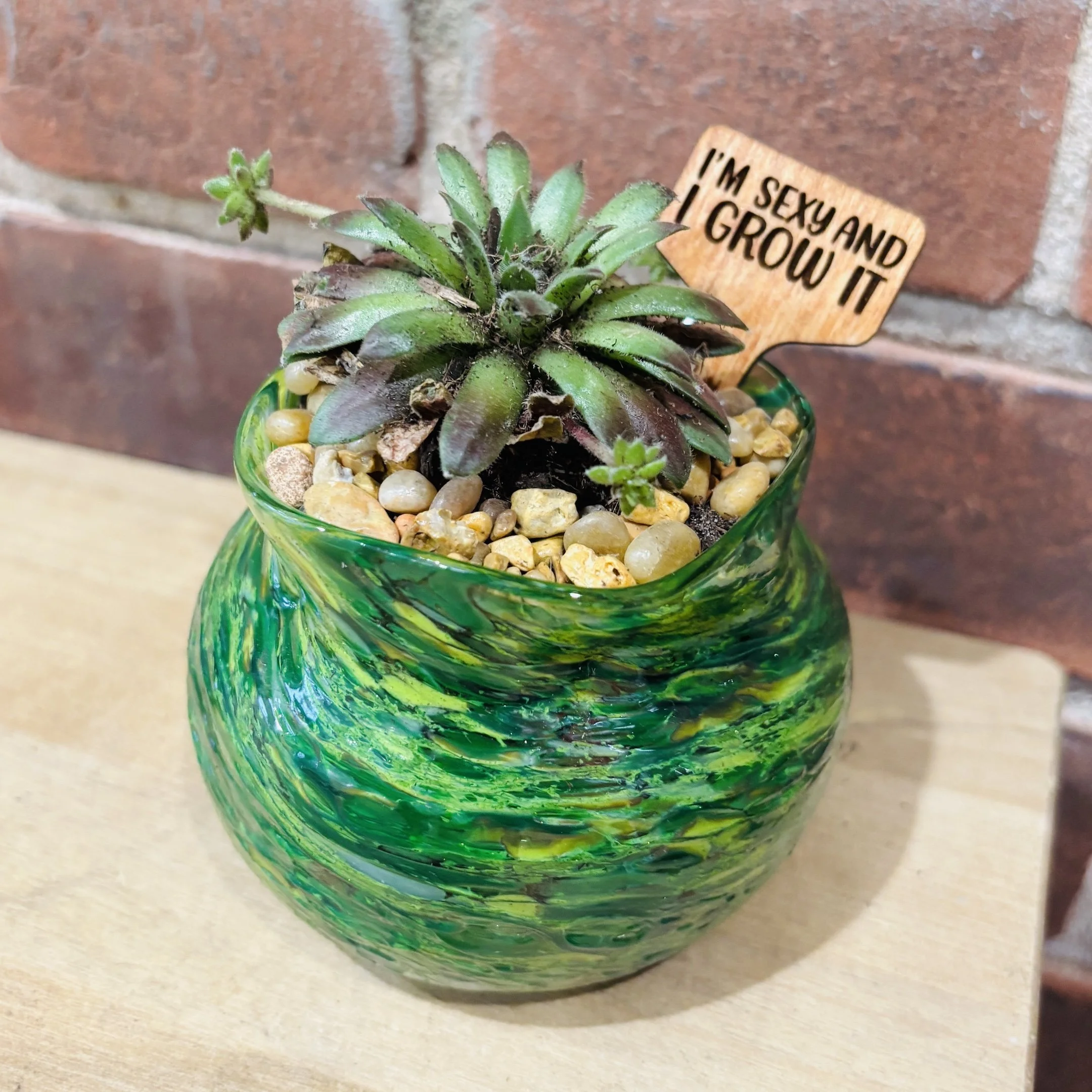 In this mini-class, you can pick your color, roll your glass and blow a mini flower pot. When you come back the next day to pick up your pot, you can plant it with a succulent at our planting bar as part of the experience. It's a great way to introduce yourself and mom to the world of art glass.