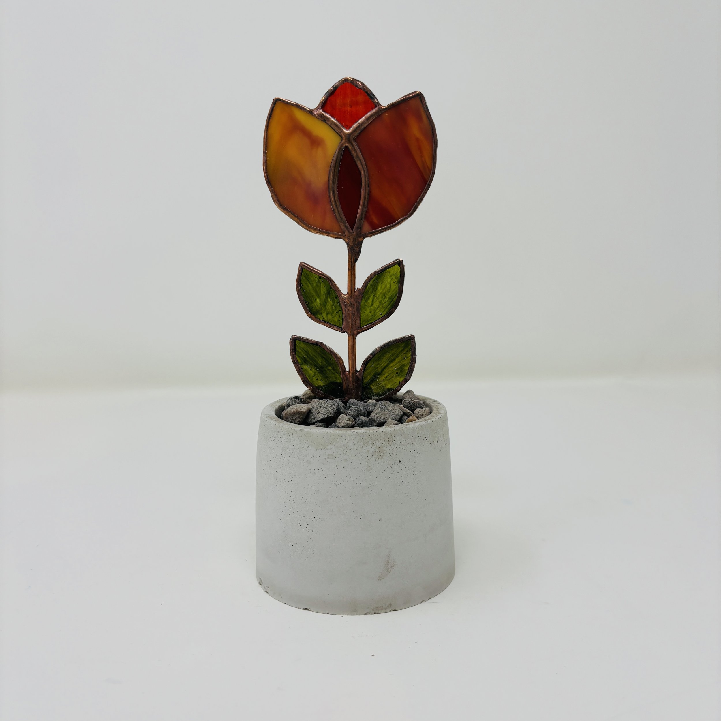 Build your stained glass skills in our intermediate class. Participants should be familiar with cutting and grinding glass, assembling pieces using copper foil, and soldering. In this class, you will practice these skills to create a one-of-a-kind flower that you will pot in one of our handmade concrete pots. It is about the cutest thing you have ever seen.